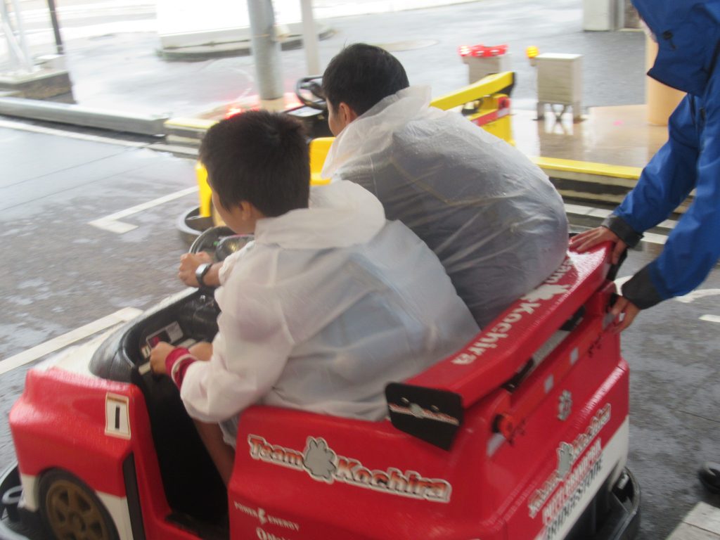 レインコートを着て、ゴーカートに出発します!少しくらいの雨は平気だよ!